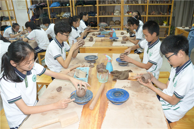 一块泥巴,在学生们的敲打、揉搓下,变成了一把茶壶,一张椅子……。最寻常不过的粘土,具有天然的亲和力,揉捏弯曲下,在匠人的手中重新拥有了生命力。双手沾上了泥巴,这又何妨?捏好的花瓶倒了,这有何妨?努力尝试中,学生们创造出属于自己的陶艺作品。