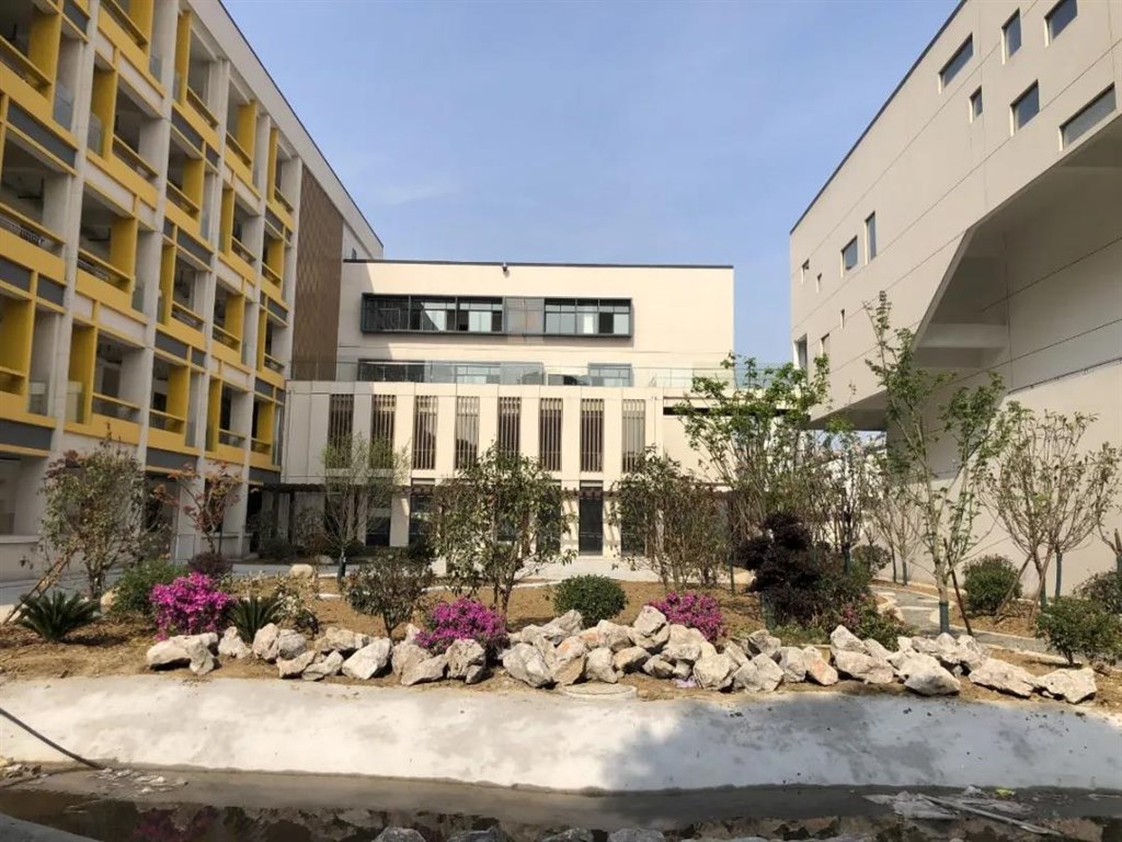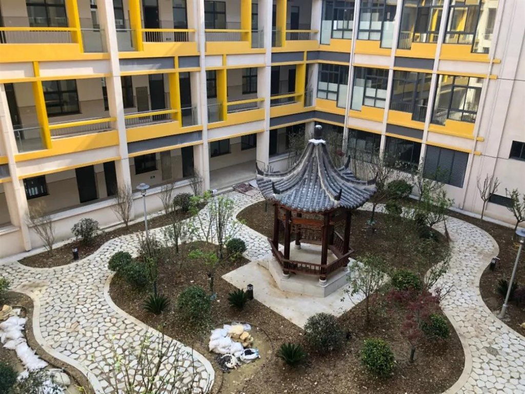 竹形清韵。仿古长廊、屏风、花岗岩广场、造景水池,依偎在中心绿化带周围。用老校舍太湖石点缀的水池与周边绿化营造出苏州园林的意境。这里有香橼、枇杷、晚樱、红枫、凌霄、果石榴、金桂、红叶石楠球、海桐球、紫藤、造型罗汉松、苏铁、红花檵木桩等品种丰富的绿植花卉。它们高低错落,绿意盎然。