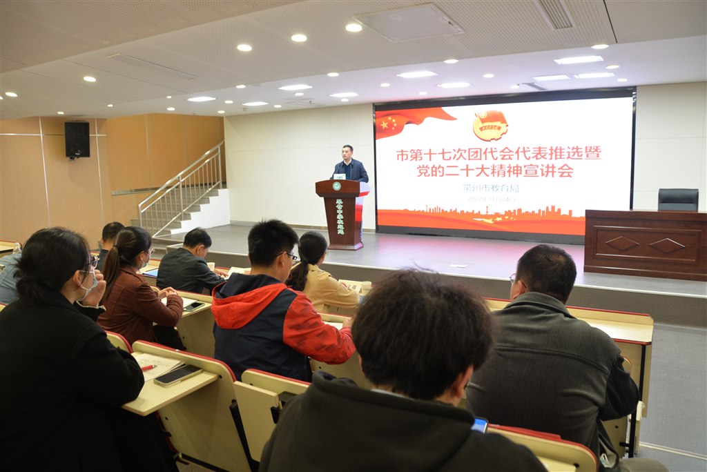 11月24日下午,常州市第十七次团代会代表推选暨党的二十大精神宣讲会在常州市翠竹中学召开。常州市教育局专职委员徐小平、常州市教育局统战与群工处处长王建强、常州市教育团工委副书记孙文淼、常州市翠竹中学党总支书记丁连伟以及局属学校共青团、少先队负责人莅临会议,王建强处长主持会议。 丁书记在欢迎辞中热情欢迎与会代表,对学校共青团工作表示高度肯定,对后续发展提出殷切期待,对于会议顺利召开表示热烈祝贺。 在王处长的组织下,常州市第十七次团代会代表推选工作顺利开展,各校参会人员根据推选要求在22位候选人中选出18位代表。 随后,徐局长围绕“二十大报告的概况和主要内容”、“二十大报告关于教育的重要论述”、“二十大报告关于青年的殷切希望”三个方面,为各校与会人员宣讲二十大精神。大会主题的介绍,“五个牢牢把握”的指引,教育使命的强调,四有青年的要求……徐局长理论结合实际,高位引领结合具体实践,生动地传达二十大精神。最后,他提出三点要求:一要头脑清醒,不断学习先进思想;二要内心清澈,经常打扫身上灰尘;三要脚踏实地,始终言行一致做事。 接着,市教育团工委副书记孙文淼围绕“青春分享,铸牢理论之基”、“青春励志,闪耀时代之光”、“青春足迹,筑牢信仰之魂”、“青春实践,增强环保之念”、“青春联谊,架构交友之桥”、“青春创优,选树先进之标”、“青春峰会,激发创新之源”、“青春携手,传递公益之爱”八个主题,结合具体活动内容,进行新学期团队工作布置。 最后,王处长总结发言。他高度肯定团队工作中谋划能力,组织能力,宣传能力的重要性,并对后续常州市共青团工作提出殷切期望。 在热烈的掌声中,常州市第十七次团代会代表推选暨党的二十大精神宣讲会圆满结束。希望团员干部扛起青年一代的使命担当,争做走在时代前列的奋进者、领航者、奉献者。脚踏实地,敢想敢为,善作善成,以实际行动践行党的二十大精神,以团结拼搏的精神开创团队工作新局面!