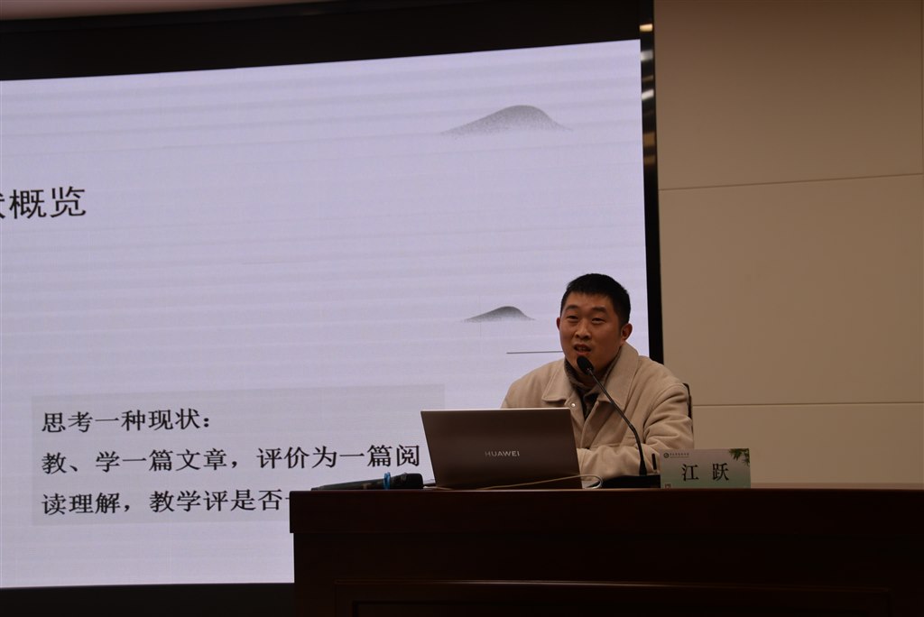 随后,二十四中江跃老师为大家做《基于不同文体的阅读思维能力培养》微讲座,江老师立足于阅读教学的现状,向大家分析了不同文体的教学侧重点,并以《智取生辰纲》为例与大家探讨在教学过程中学生思维能力的培养,让大家受益颇多。
