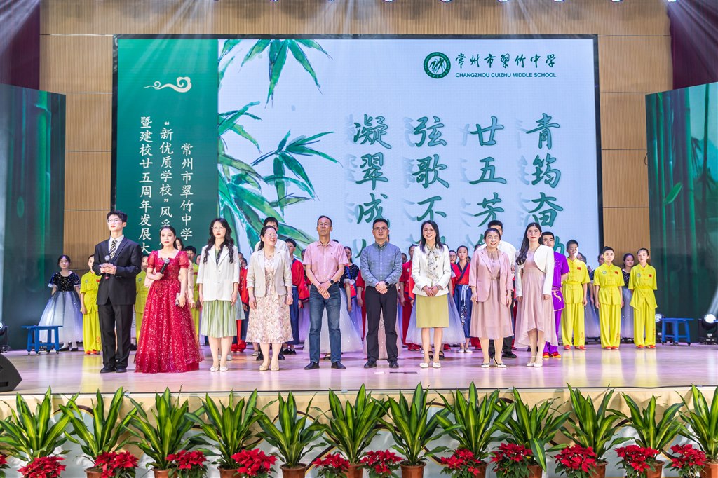 创新奋进传薪火, 励志求真育英才。 从濯樱园的满树繁花到谦竹园的廊桥屏风, 从紫藤花的馨香满溢到合一亭的书声琅琅, 岁月里, 有上下求索的坚持, 有日月辉煌的澎湃。 这里,是翠中学子梦想诞生的地方 这里,谦雅君子不断书写着崭新的篇章。 从时光的那头走来, 无数青春交织延续着翠中的脉搏, 站在山河岁月的过往中, 那清越、厚重的回声, 穿越时空在翠竹园中回响。 廿五芳华,凝翠成竹! 4月28日,翠竹中学迎来了一场盛会——“新优质学校”风采展示暨建校25周年发展大会。 春色不老,夏意渐浓 万物更迭,美好如初。 二十余载,向阳生长,翠竹正青春; 三年韶华,竹园相逢,少年正拔节。 全体师生用真挚的热爱庆祝着这一次的相遇! 第一篇章:清韵悠悠好风姿! 师生精心准备了新优质展演的节目。《翠中青筠志 文化咏流传》音诗画讲述了翠中学子与学校的相遇、相知、相伴,书法社团、留清竹刻社团、绘画社团、吟诵社团、手工物语社团齐上阵,社团老师们与孩子们共同演绎,动人心弦。一曲民乐合奏《芒种》,蕴含着在翠中的沃土上勤勉播种的常态!《惊鸿游龙最少年》,由武术社团带来的一段武术表演展现了翠中学子勃发的力量。 “四节营”的老师们也走上舞台,讲述着自己的专业成长之路,杏坛沐春晖,泮池育桃李。师者自己向下扎根,向上成长,也滋养着一届届翠中学子。合唱团带来经典小合唱《懂你》,诉说师生相依相偎的温暖。压轴登场的是校舞蹈团带来的《青春纪念册》,每个人都在初中三年旅途中收获了自己的青春故事,撷取美好,纪念成册,珍藏于心。 第二篇章:青筠奋励好时光! 老师们将翠中的课堂生态展现在莅临现场的嘉宾面前,全学科、全覆盖开放课堂,来自常州市教科院的专家团队,现场听课、评课,给予了高度评价。学校以“核心素养”为纲、以“正向课堂”为追求,以“对分课堂”为手段,在项目化、信息化的推动下,贯彻落实“双减”精神,打造“竹韵”课堂。 对分课堂创始人张学新教授莅临劲节营,指导青年教师开展教学论坛。数学组张晴怡老师、英语组瞿曜老师与大家分享了自己的教学设计。张学新教授从“对分”的角度进行课堂指导。他高度肯定了信息技术与数学课堂相结合的数字课堂形式,并对于课堂设计中的对分环节进行深度剖析。深耕课堂,杏坛沐芳,魅力对分,活力无限。 常州市名班主任工作室吕丽老师现场观摩了吴艺佳老师带来的班会公开课。吴老师的挫折教育主题班会基于学生心理发展特点和真实的问卷调查情况设计,五个活动环环相扣,板块融合巧妙,问题设计精妙,活动策划玄妙,善于旁征博引,文化底蕴深厚,为学生增加了面对挫折的勇气和战胜挫折的底气。 第三篇章:青青翠竹好成长! 课程是培育学生核心素养的重要载体,学校打造“竹蕴”课程群,以学生的核心素养发展为本,培养学生适应终身发展和社会发展需要的必备品格,促进学生全面发展、不断成长。 缤纷的课程,让每个孩子找到适合自己的成长发展区,每个孩子收获属于自己的闪耀青春。学校的缤纷社团给了孩子多样的选择空间,下午第三节课,孩子们都有序地开启了本周的社团学习,留青竹刻、手工物语、中国舞、播音与主持……二十多个社团,总有一个与孩子相契合! 看似寻常最奇崛,成如容易却艰辛。翠竹中学积淀的是行稳致远的长度、追求卓越的高度、人文荟萃的厚度、爱在校园的温度。每一位翠中人的名字都值得被铭记,每一点努力都值得被尊重,每一个翠中人共同点亮了学校历史长河的璀璨星空! 对历史的最好纪念,就是创造新的历史!全体翠中人,沐光而行,在教育高质量发展的路上,砥砺前行,行稳致远,聚萤作灯,造炬成阳,凝翠成竹! 撰稿:柏佩婷 拍摄:田盈 审核:宋华燕