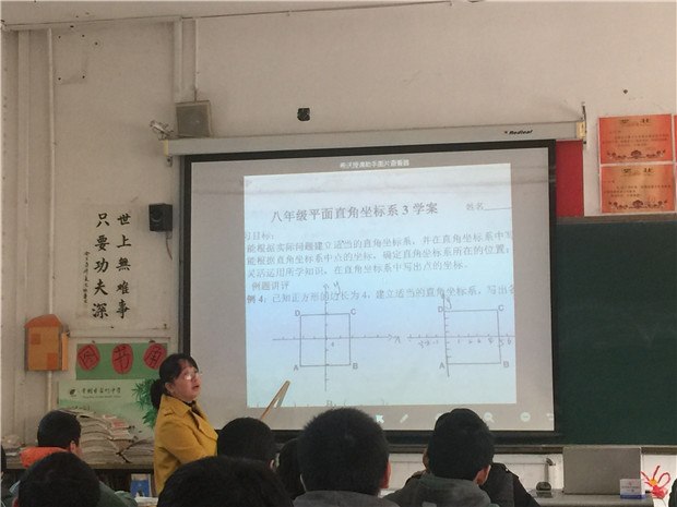 刘立萍老师随后开设了同题公开课,刘老师以生活情境引入,激发了学生的学习兴趣。在例题的学习中,她带领学生将生活中的长度拓展到数学中的坐标,印证了数学来源于生活的真理。学生探索解法时,刘老师在学生之间穿梭,时不时拿出手机将学生的做法拍摄下来,并将照片通过软件导到电脑中,通过投影幕布展现在学生们眼前,师生一同评判。思维碰撞出各种火花之际,她抓住时机,引导学生总结,总结出的结论条理清晰、细致全面,令人过目难忘。