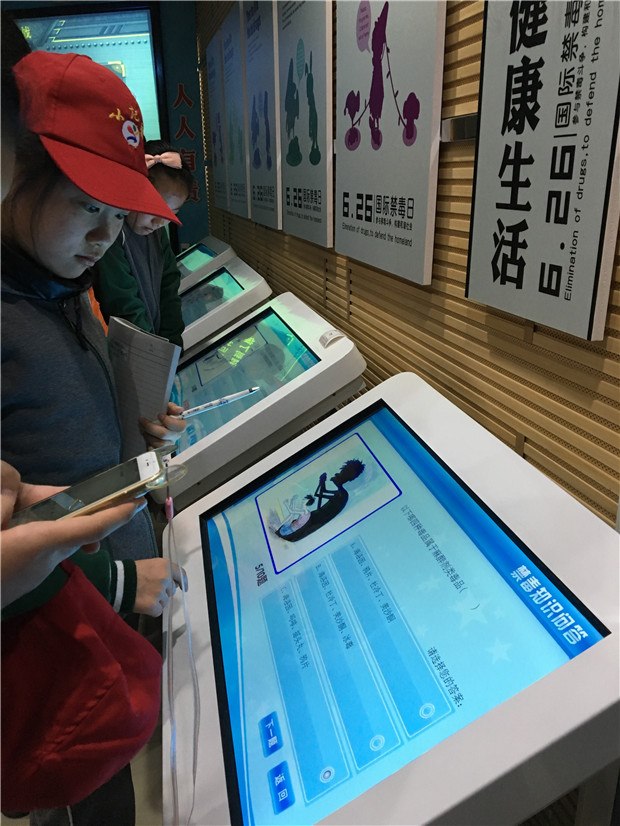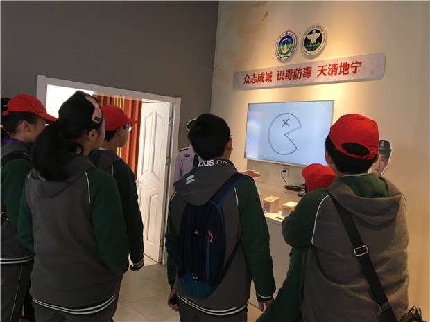 带着一份陌生的憧憬,带着一份强烈的好奇,来自翠竹中学的40名小记者来到常州第四制药厂禁毒教育基地,进行了为期半天的游览参观。展馆以其独具匠心的环境设计、夺人眼球的互动游戏、震撼人心的情景再现、诙谐幽默的禁毒演讲,让禁毒教育生动鲜活起来。 难忘1:吸睛的展馆布置    位于顶层的禁毒展厅,一幅幅图片讲述了毒品的发展演变,美丽的外表下暗藏着危险的信号,透明的玻璃展柜中的毒品模型让人对毒品有了更深层以及更直观的认识。 难忘2:巧妙的互动游戏    毒品知识知多少?在楼下的互动游戏厅,开启了毒品知识闯关模式。“全民杀毒战”,利用高科技热感应技术在电视机上模拟切水果游戏,将不同的毒品一一切碎;“灭毒大作战”,模拟射击游戏,将常见药品与毒品、缉毒警察与毒贩等区分,力求消灭毒品毒贩;“禁毒知识作答”,选择题的形式迅速反映禁毒相关知识,在玩中学,在学中记,枯燥难懂的禁毒知识变得有趣! 难忘3:有趣的禁毒演讲